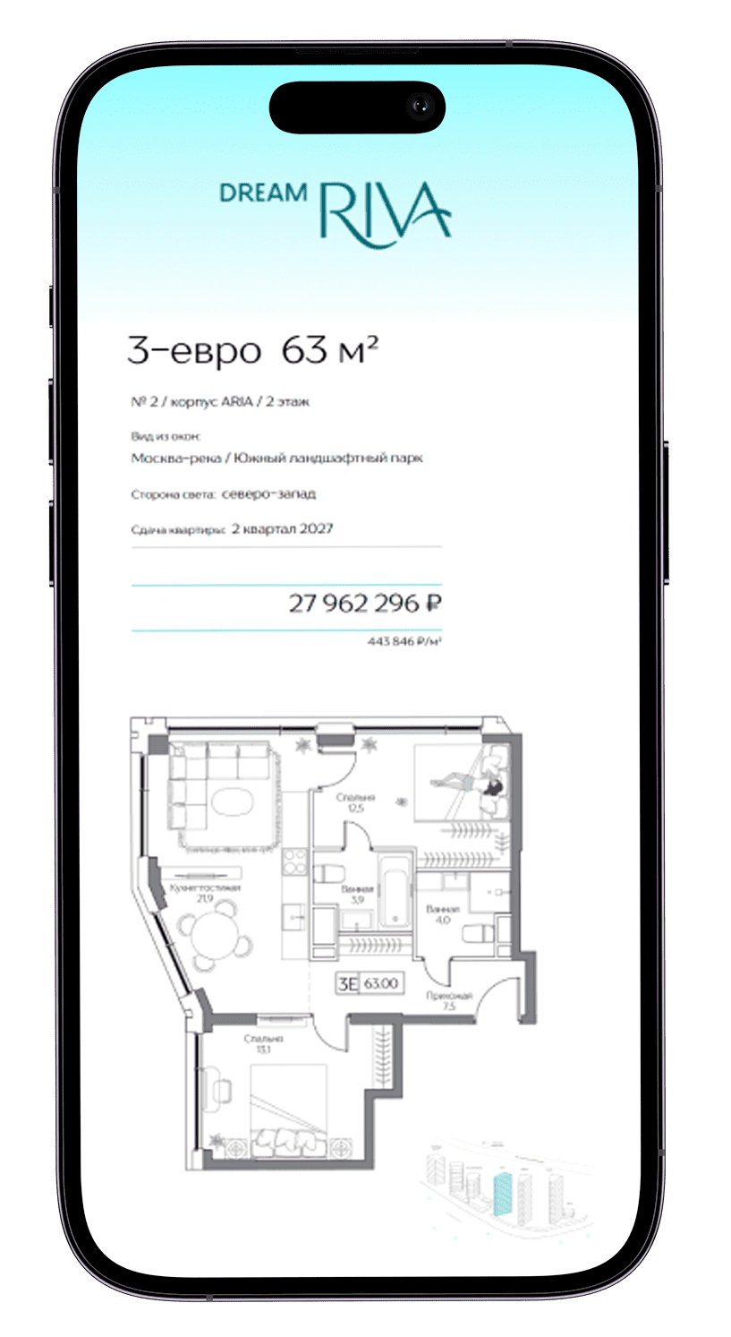 Ключевая особенность проекта Дрим Рива — до 95% видовых квартир. Панорама Москвы-реки или парка открывается уже с первого жилого этажа. Планировки выстроены по принципу функционального зонирования: кухни-гостиные как центр квартиры, мастер-спальни, рациональная геометрия помещений без лишних транзитных площадей.